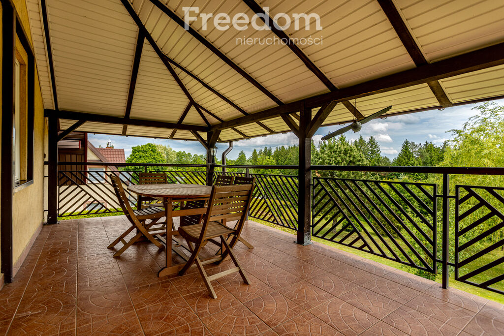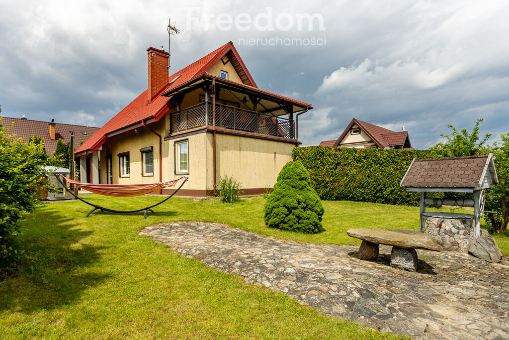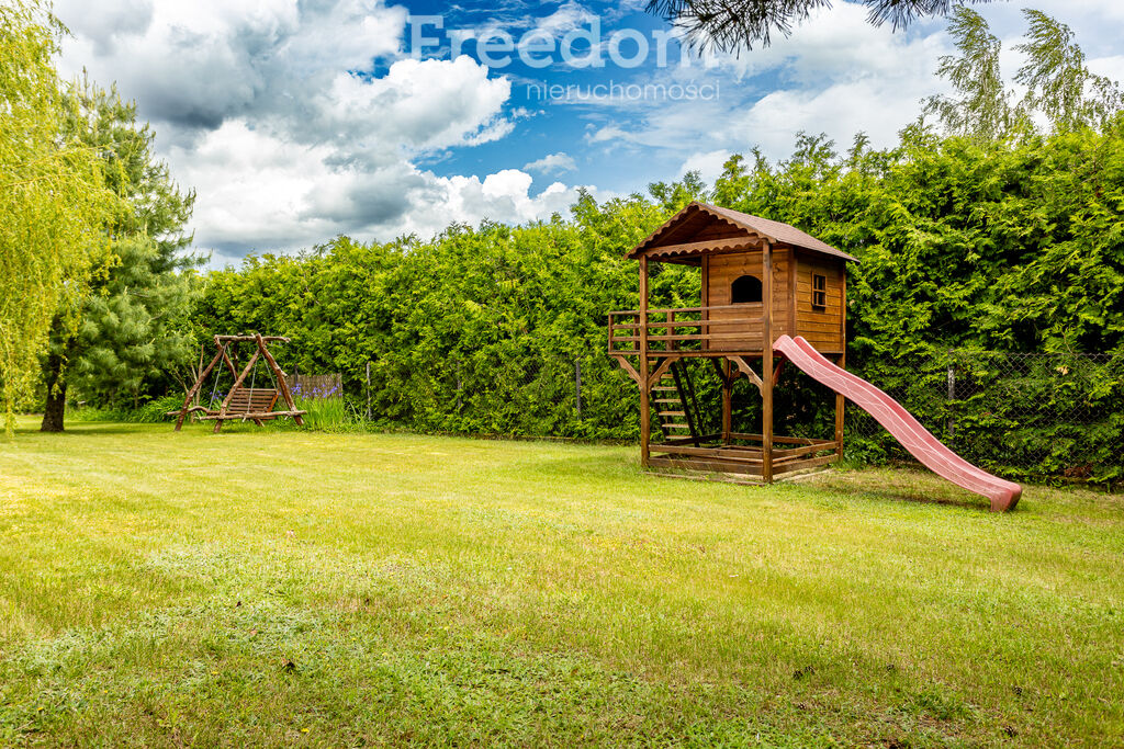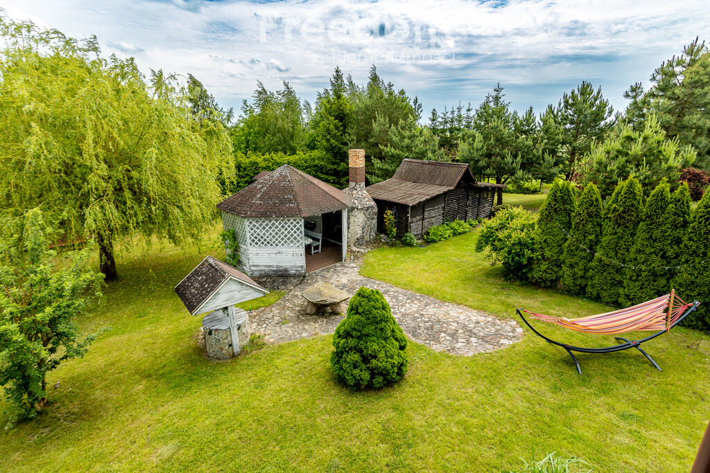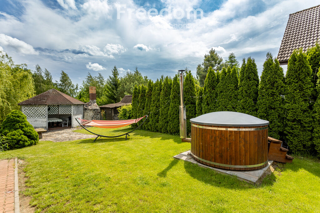 Teren jest zadbany, z licznymi nasadzeniami, rekreacyjną drewnianą